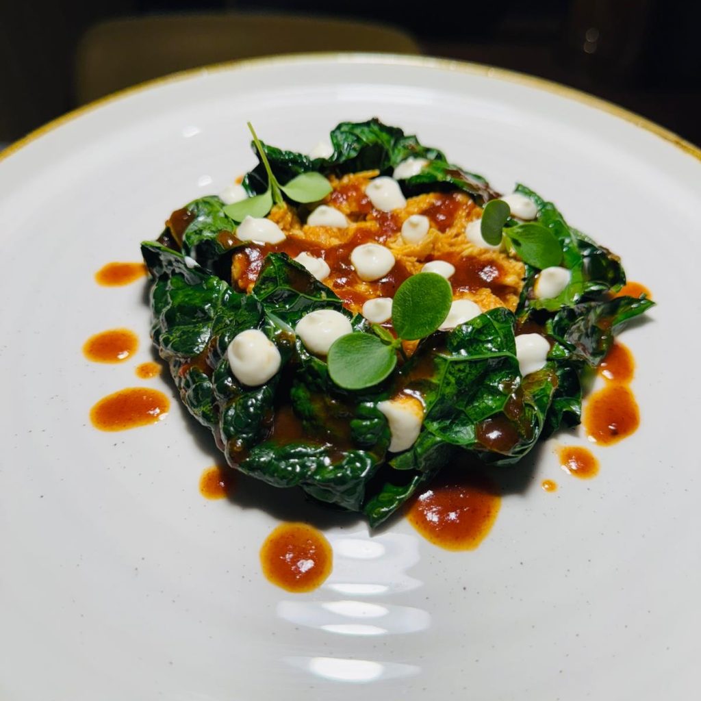Gallina padovana nel suo “nido” croccante di pasta filo, valeriana, spuma di caprino, pomata al pomodoro, pinoli e uvetta