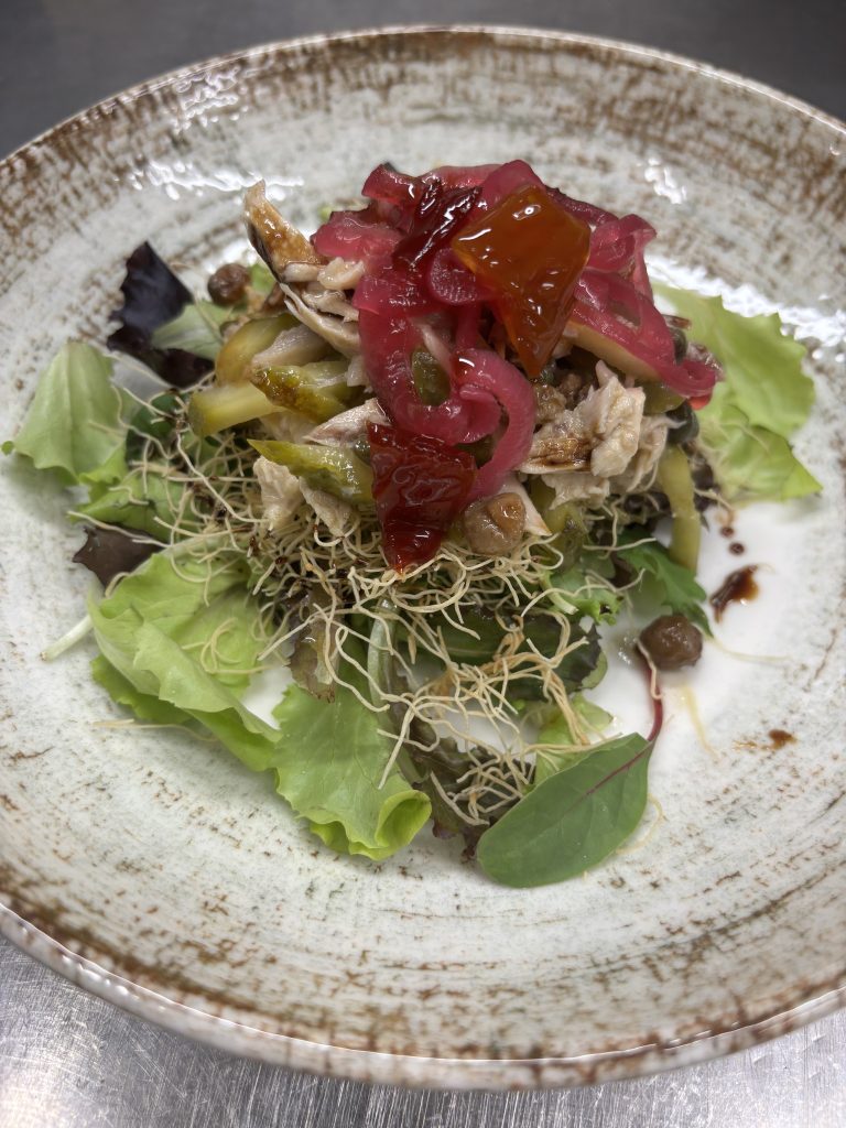 Insalata di Gallina padovana in agrodolce: gallina cotta a bassa temperatura, capperi, cetriolini, cren, senape, uvetta, frutta candita, cipolla confit